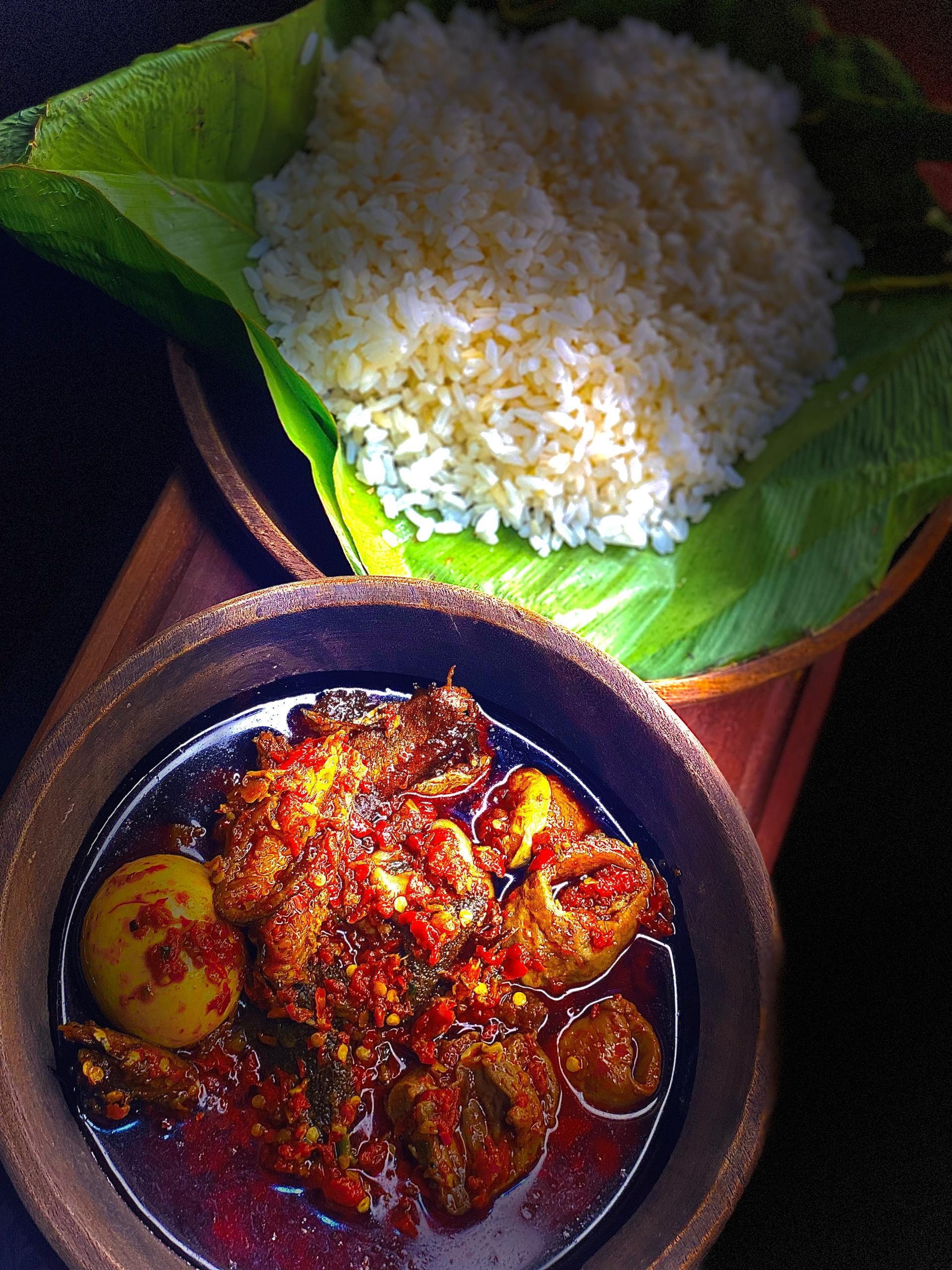 Assorted meat stew with steamed rice, boiled egg & fried plantain